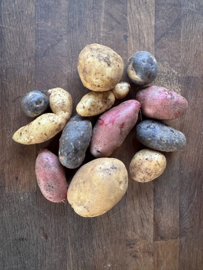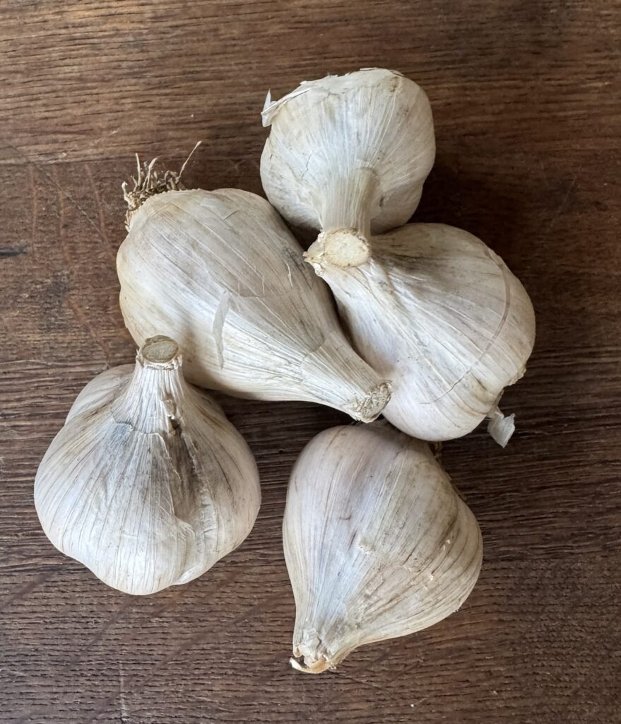 Also new this year is the first harvest of our Music garlic that we’re able to share, originally started from a single pound we purchased from a friend in Canada in 2020. That gave us just 40 cloves to start with. Over the past four years we’ve been harvesting, dividing, and replanting. This season, after planting nearly 600 cloves, we finally have enough to share some with you in your boxes this week.