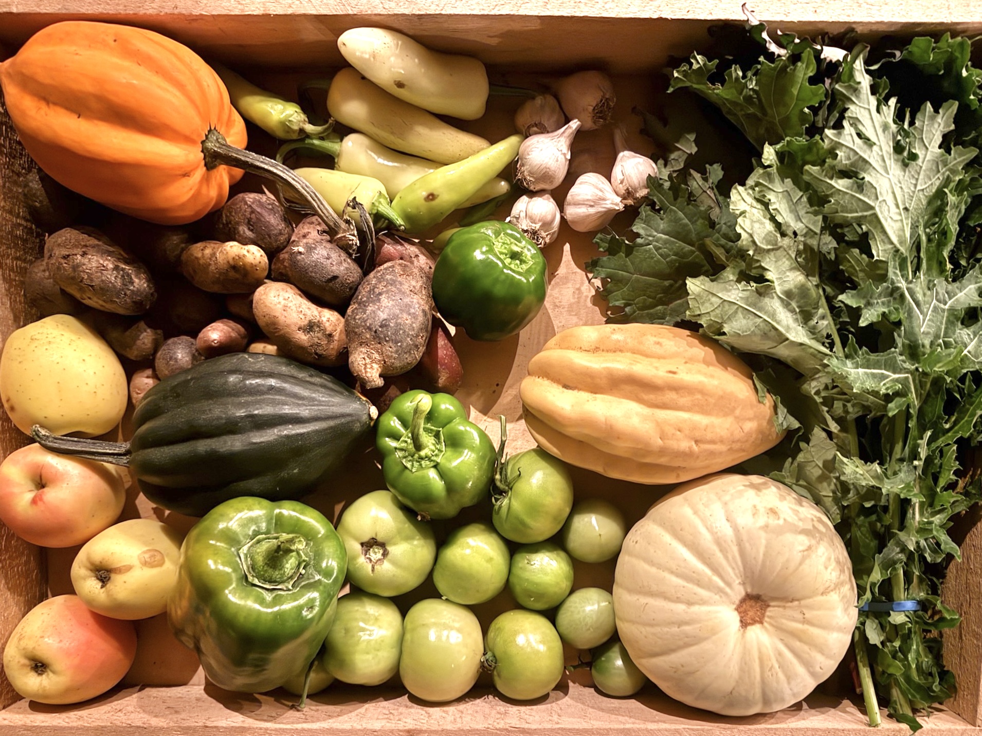 Acorn Squash, Bell Peppers, Garlic, Gold Rush Apple, Green Tomatoes, Rainbow Jalapeños, Potatoes, Red Russian Kale, Snowball Pumpkin, Thelma Sanders Squash
